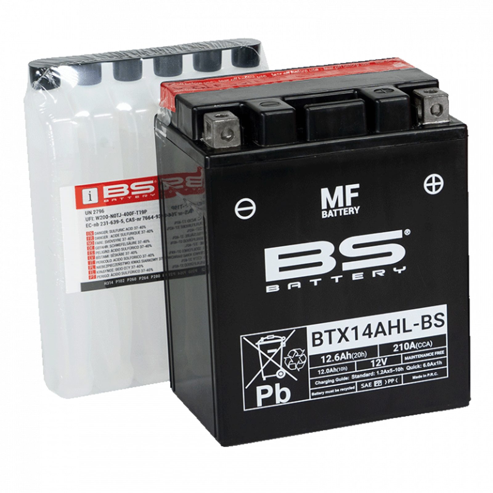 Baterie BTX14AHL-BS patří do naší řady MF. Je dodávána s balením kyseliny a před prvním použitím musí být aktivována jejím naplněním. Po aktivaci je zcela uzavřená a bezúdržbová, nabízí vysoký výkon a nevyžaduje doplňování vody.