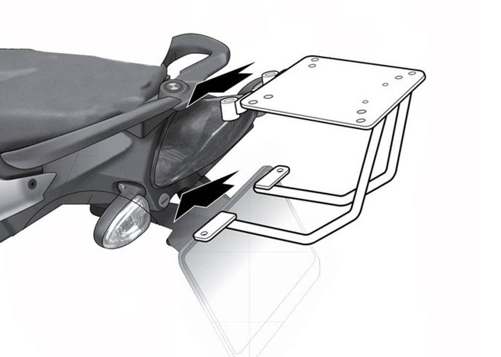 K upevnění vrchního kufru SHAD na motorku stačí namontovat tuto montážní sadu, plotna je vždy součástí kufru (kromě kufrů TR48/TR37).