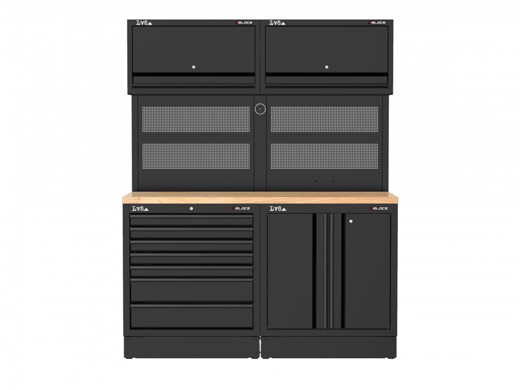 Pracovní stůl délky 1600 mm se 7zásuvkovou skříňkou a dvoudveřovou skříňkou s nastavitelnou policí a zámkem. Masivní dřevěná pracovní deska, dvojitý perforovaný panel na nářadí, dvě nástěnné úložné skříňky a příprava pro elektrickou zásuvku. K dispozici také v provedení s nerezovou nebo melaminovou deskou.